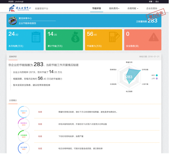 通過對單位各能耗點位的監(jiān)測和分析,對單位的整體能耗使用情況進行綜合評估,并給出可執(zhí)行的管理及操作建議,供管理者參考。