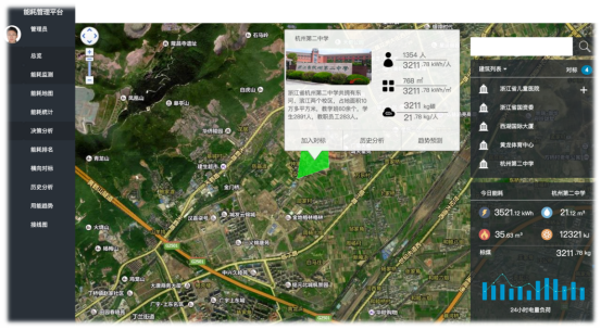 對整個監(jiān)控區(qū)域內的各個對象的能耗情況進行橫向對標,可根據電水氣熱的總能耗、分項用電、人均用能、單位面積用能、無效能耗等能耗指標,進行年月日等時間的多維度對標。整體操作基于地圖GIS系統(tǒng),可快速定位建筑或單位進行比對。