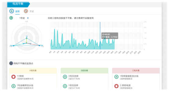 通過對三相用電的電流平衡分析,定位單相供電設備布線不合理的位置,避免引起三相用電不平衡。從而減少對變壓器效率的影響及設備使用壽命,避免線路老化、設備故障。